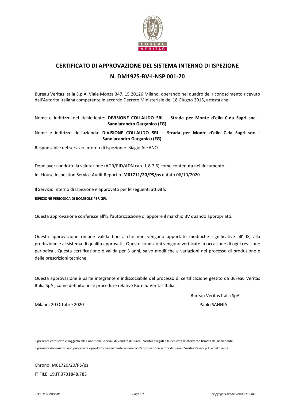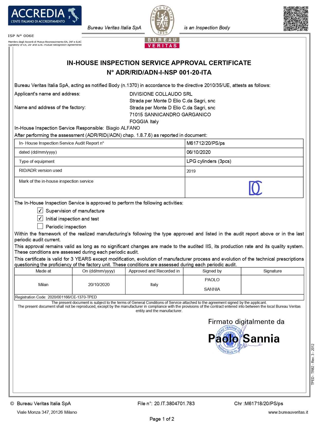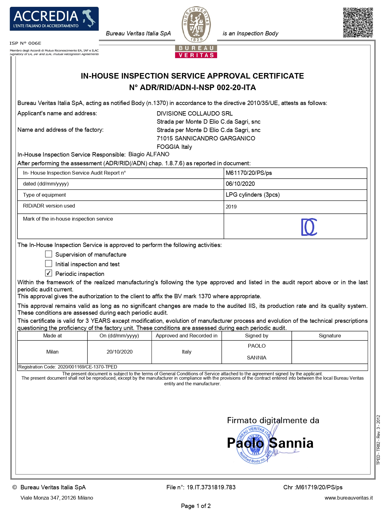 Divisione Collaudo è tra i maggiori esponenti nazionali attivi nella riqualifica di bombole di diversa tipologia, dai 10 ai 62kg; dotata di impianti di verniciatura a polvere (privi di solventi) ed avvalendosi dei più importanti Fornitori qualificati nel panorama europeo di beni e servizi. La Qualità è un impegno costante e strategico che portiamo avanti ogni giorno ed in ogni Nostra attività industriale per aumentare la Nostra presenza sui mercati Internazionali!